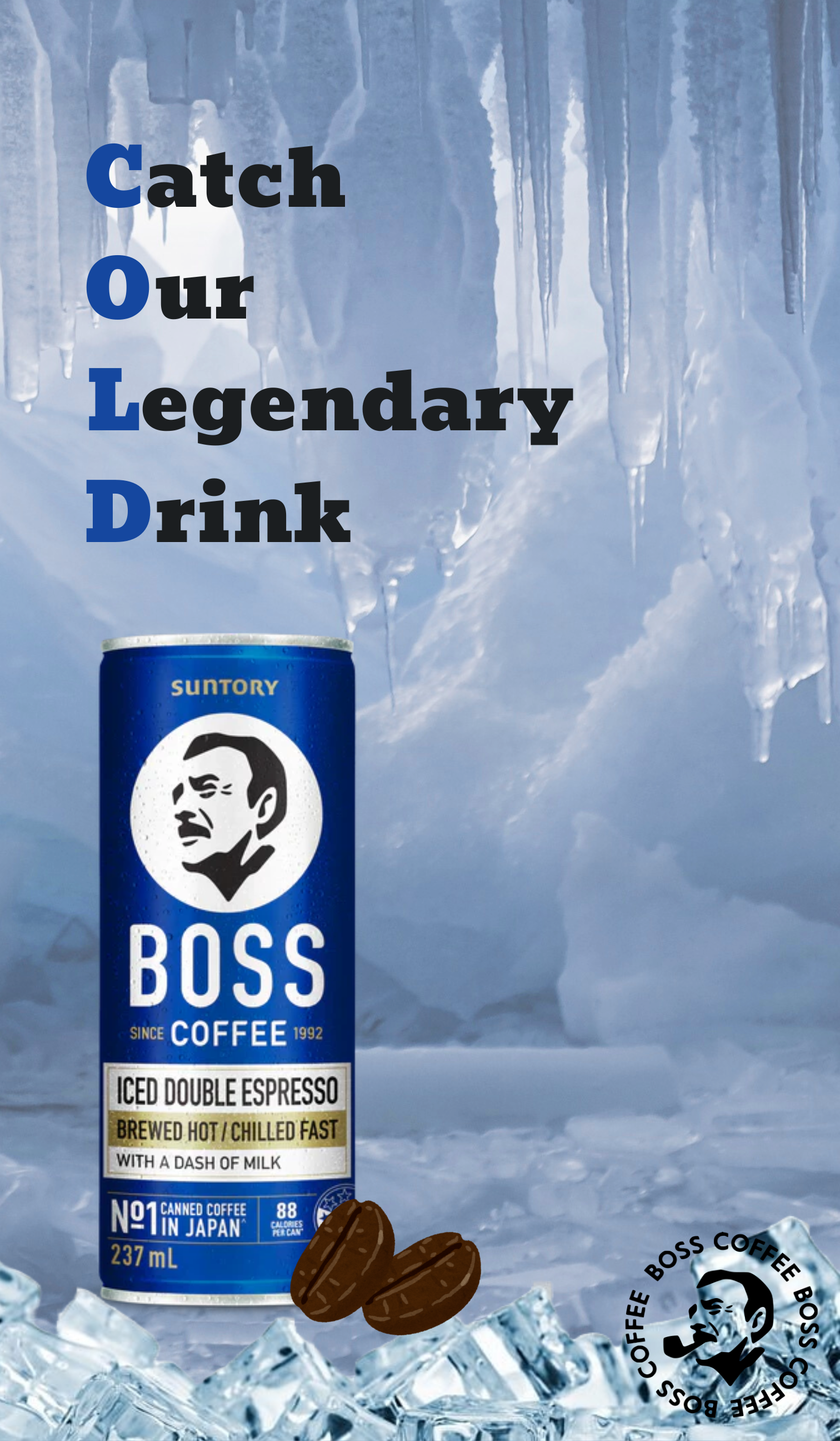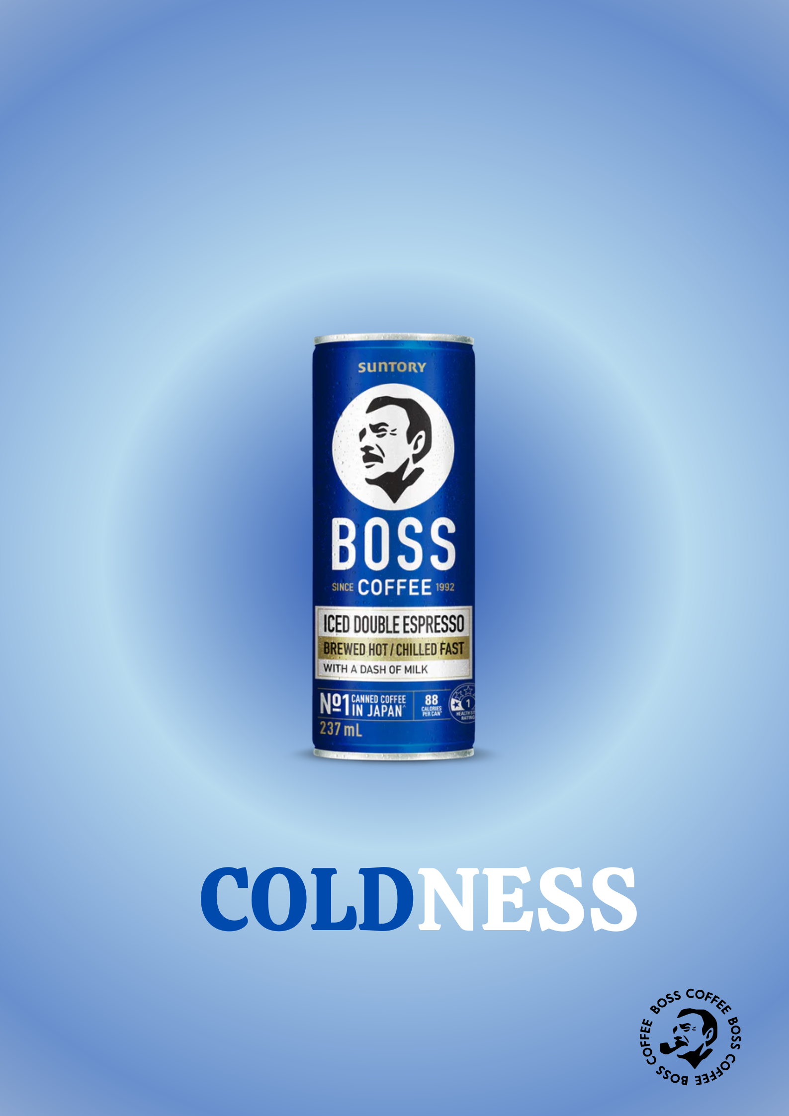 Idea: Boss Coffee is defined as a regular guy archetype, which emphasises its objective in being everyone's daily coffee. The boss Coffee's tone of voice refers to a creative, playful and motivational tone to boost energy, just as coffee does. The headline is short but engaging, highlighting the word "cold" in blue to emphasise a sense of refreshment in iced Boss coffee. Typography is an integral part of the ad since it creates an emphasis that attracts the audience. The colours and visuals of the ad emphasise an icy blue background to highlight the cold and refreshing nature of the product. The proposition is well-structured, guiding the audience on what to look for first.